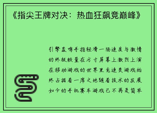 > 引擎轰鸣,手指轻滑,一场速度与激情的终极较量在方寸屏幕上激烈上演。 在移动游戏的世界里,竞速类游戏始终占据着一席之地。随着技术的发展,如今的手机赛车游戏已不再是简单的娱乐消遣,而是融合了视觉...