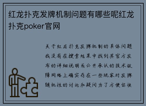 关于红龙扑克发牌机制的具体问题,我没有在搜索结果中找到其官方发布的详细说明或公开承认的技术故障。网络上确实存在一些玩家对发牌随机性的讨论和疑问。 为了方便你快速了解,我将这些来自玩家社群的常见反馈和平...