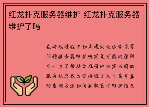 根据你的问题,我查阅了多个与红龙扑克相关的网站。目前没有明确信息显示其官网已经关闭,但不同渠道提供的官网地址并不统一,这可能导致了你的困惑。 红龙扑克官网及平台信息 当前网络上关于红龙扑克的信息比较...