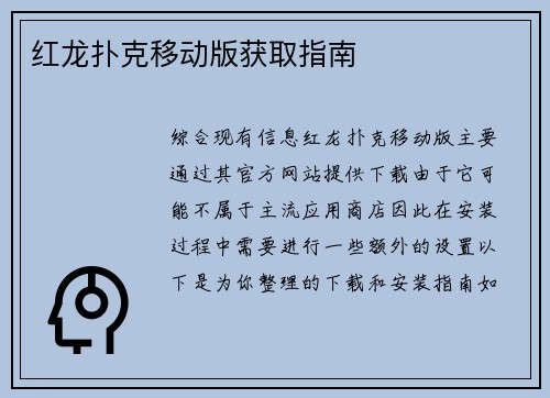 综合现有信息,红龙扑克移动版主要通过其官方网站提供下载。由于它可能不属于主流应用商店,因此在安装过程中需要进行一些额外的设置。 以下是为你整理的下载和安装指南: 如何下载与安装 由于信息来源均为第三...