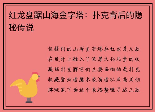 你提到的“山海”、“金字塔”和“红龙”是几款在设计上融入了浓厚文化元素的收藏级扑克牌。它们主要面向的是扑克收藏爱好者、魔术表演者以及花式切牌玩家。 下面这个表格整理了这三款扑克的主要信息,方便你快速了...